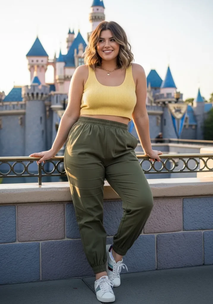 A crop top paired with joggers creates a trendy and comfortable Disneyland outfit that feels modern and easy to wear. The relaxed fit of the joggers balances the fitted top perfectly. This combination allows for easy movement and all-day comfort. It’s ideal for long park days when you want to stay stylish. The overall vibe is sporty and casual.