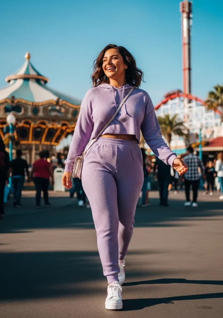 A matching lounge set creates a cohesive and comfortable Disneyland outfit that looks effortlessly put together. The coordinated pieces make styling easy while still looking polished. This outfit feels soft, relaxed, and very on-trend. It’s perfect for those who prioritize comfort without sacrificing style. The overall look is minimal yet chic.