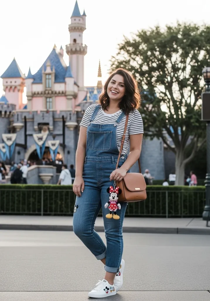 Overalls paired with a striped tee create a playful and slightly vintage Disneyland outfit. The overalls add a fun, youthful vibe while the striped tee keeps the look classic. This combination feels very on-theme without being too costume-like. It’s comfortable, practical, and visually interesting. The overall vibe is cute and nostalgic.