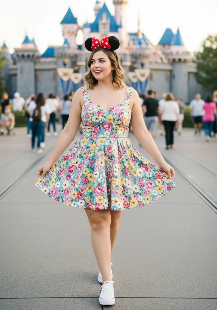 A floral dress paired with Minnie ears creates a magical and feminine Disneyland outfit. The dress adds softness and movement, while the ears bring in the Disney theme. This combination feels playful yet elegant. It’s perfect for capturing those iconic park photos. The overall vibe is dreamy and cheerful.