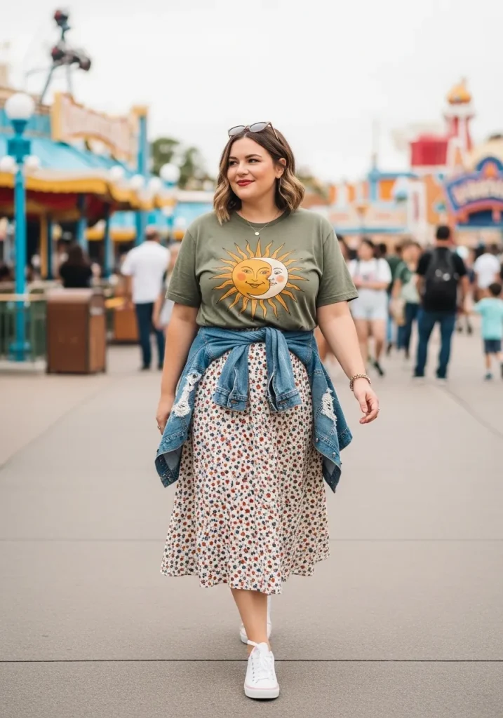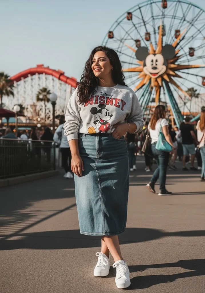 A graphic tee paired with a midi skirt creates a balanced Disneyland outfit that feels both casual and stylish. The tee keeps the look relaxed, while the skirt adds a touch of elegance. This combination is perfect for mixing comfort with style. It feels modern and very wearable. The overall vibe is effortless and chic.