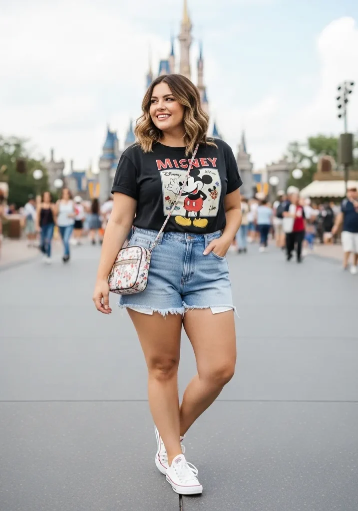 Denim shorts paired with a graphic Disney tee create a casual and comfortable outfit that’s perfect for a long day at the park. The breathable fabric keeps you cool, while the graphic tee adds a playful Disney touch. This combination is simple yet very effective for a theme park setting. It feels relaxed and easy to wear all day. The overall vibe is effortless and fun.