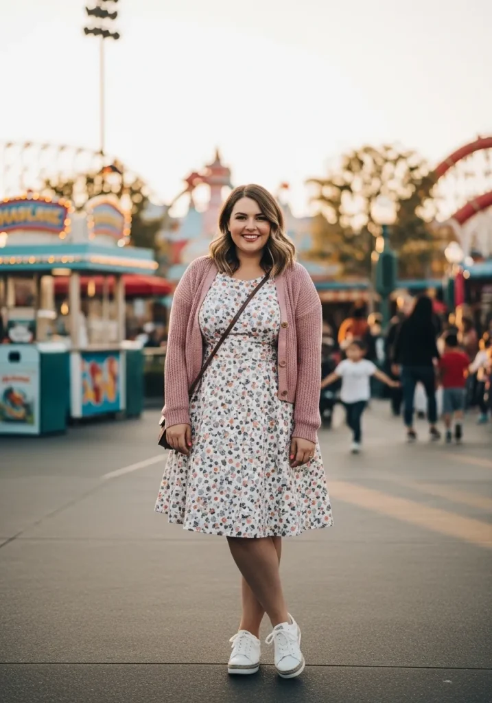 A lightweight cardigan layered over a dress creates a cozy and versatile Disneyland outfit. The cardigan adds warmth without making the outfit too heavy. This combination works well for changing temperatures throughout the day. It feels soft, feminine, and comfortable. The overall look is relaxed and stylish.