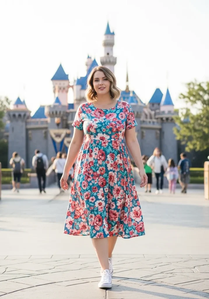 A flowy midi dress paired with sneakers creates a comfortable yet stylish Disneyland outfit. The lightweight fabric keeps you cool while the sneakers ensure you can walk all day without discomfort. This outfit feels feminine while still being practical. It’s perfect for those who want a soft and elegant look at the park. The overall vibe is relaxed and pretty.
