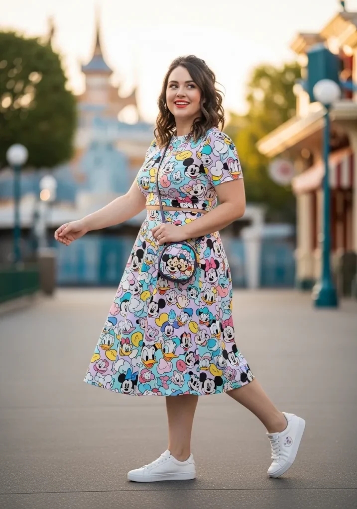 You can pair this look with sneakers or sandals for comfort. Adding a crossbody bag keeps things practical. Light, breathable fabrics work best for this style. Soft pastel or floral prints enhance the aesthetic. This outfit is perfect for a magical day at the park.