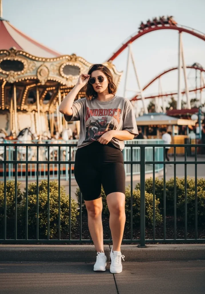 An oversized tee paired with biker shorts creates a trendy and comfortable Disneyland outfit. The loose fit of the tee adds comfort while the fitted shorts balance the silhouette. This combination is perfect for staying cool and moving freely throughout the day. It feels modern and very easy to wear. The overall vibe is sporty and stylish.