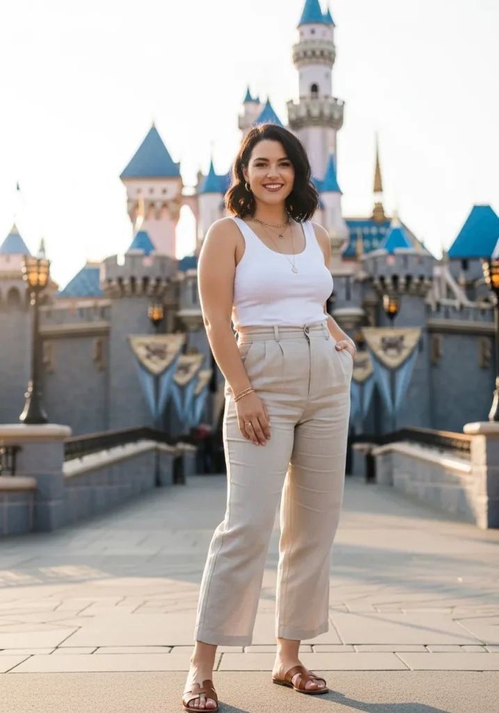 A tank top paired with linen pants creates a breathable and stylish outfit for warm Disneyland days. The lightweight fabric keeps you cool while still looking polished. This outfit feels relaxed and elegant. It’s perfect for staying comfortable without looking too casual. The overall aesthetic is minimal and chic.