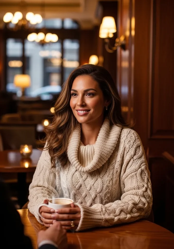 A neutral knit paired with tailored trousers is one of those First Date Outfits that feels calm, confident, and completely natural. This look works beautifully for a First Date Outfit Coffee, especially if you’re meeting for a relaxed conversation where comfort matters just as much as style. Soft beige, oatmeal, or camel tones create a Neutral Winter Outfit that feels warm and inviting without trying too hard.