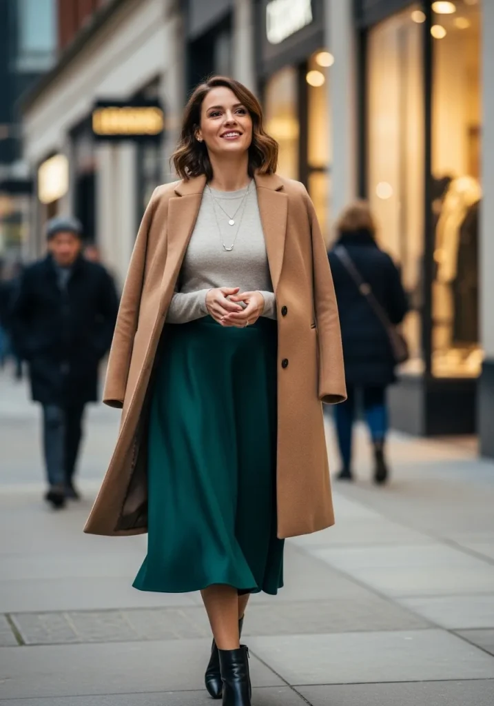 A flowing midi dress paired with a long coat is ideal for a Fancy Dinner or evening plans where elegance matters. This look creates a graceful silhouette that fits beautifully into What To Wear To Dinner Date styling. Soft fabrics and muted colors enhance the romantic winter vibe.