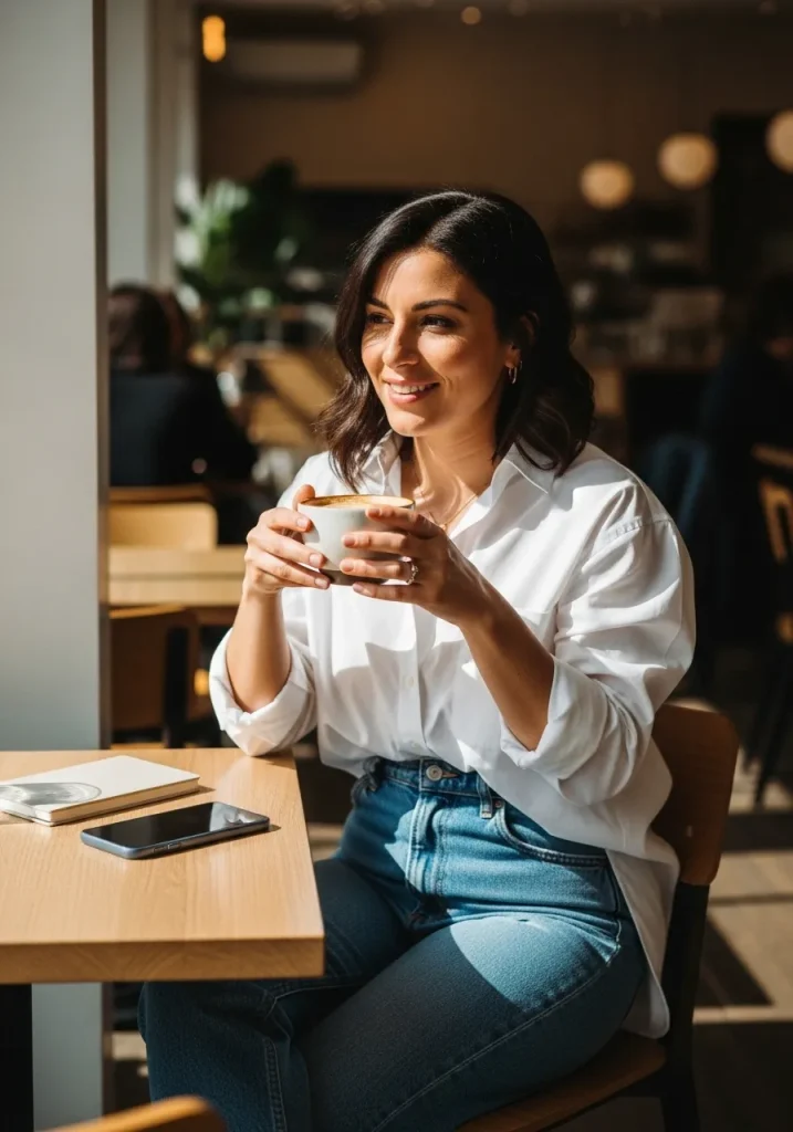 A crisp button-down styled with straight jeans is a timeless answer to What To Wear For A Coffee Date. This combination feels clean, confident, and approachable, making it perfect for a First Date Outfit Coffee setting. Light layers keep it seasonally appropriate for Winter Fashion Looks.