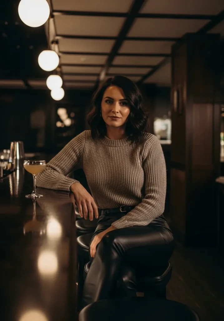 A knit top paired with leather pants creates a bold yet balanced Hot First Date Outfit. This combination feels modern, confident, and ideal for nighttime plans like drinks or a bar meet-up. The soft knit keeps the look grounded while leather adds edge.
