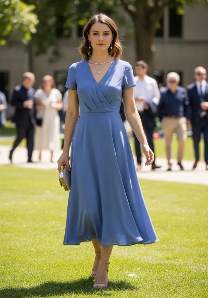 An A-line dress is one of the best choices for graduation guest outfits for women, especially if you’re looking for a comfortable yet stylish option. The A-line shape suits most body types and provides ease of movement, which is crucial when attending a graduation ceremony or a graduation lunch with family afterward. Choose a knee-length A-line dress with a fitted bodice and flared skirt to create a graceful, feminine silhouette.