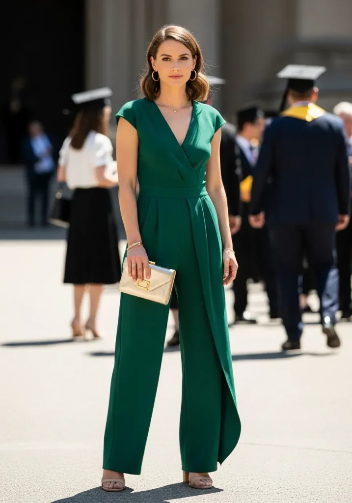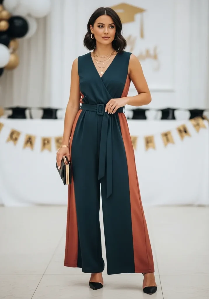 If you want something more contemporary and daring, a jumpsuit is an excellent option for graduation guest outfits. The beauty of a jumpsuit lies in its versatility—whether you’re attending a college graduation or a high school graduation guest ceremony, it is a stylish alternative to a dress. Opt for a jumpsuit with a fitted top and wide-leg trousers for a flattering silhouette.