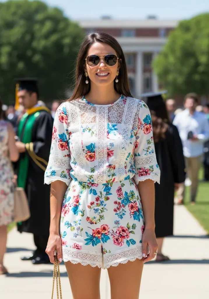 A romper can be a fantastic option if you’re attending a more casual or outdoor graduation. This playful outfit is easy to move in and adds a fresh twist to traditional graduation guest outfits. A well-fitted romper with elegant details such as lace, ruffles, or a sleek belt will keep the look sophisticated while still maintaining a youthful energy. For a high school graduation guest, you can go for bold colors like crimson, emerald green, or floral prints to stand out in the crowd.