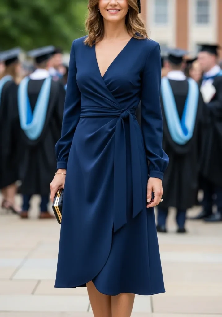 A tailored wrap dress is perfect for those looking for a flattering silhouette that enhances their natural shape. The wrap design cinches at the waist, creating an hourglass figure while maintaining a modest yet fashionable appearance. This style works wonderfully for any graduation event, whether you’re attending a high school ceremony or a college graduation.