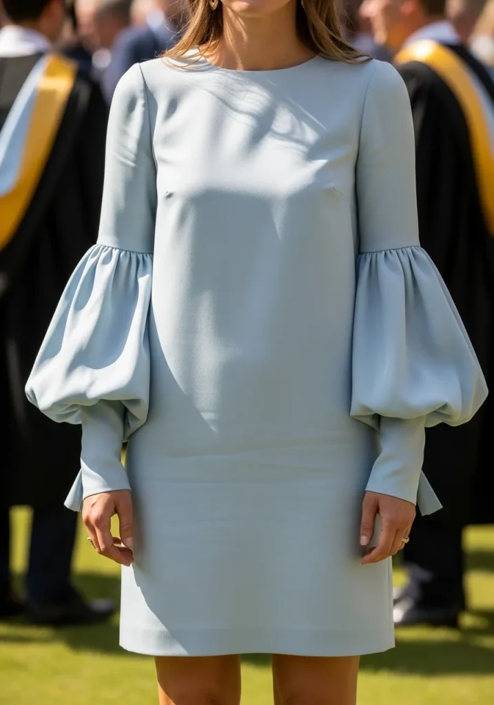 This look works well for a graduation lunch or for an afternoon ceremony, especially when the dress code is slightly more relaxed. Pair it with classic heels or even flat sandals to keep the look casual yet polished. A shift dress with dramatic sleeves is ideal for a high school graduation guest outfit, combining elegance and modern fashion effortlessly.