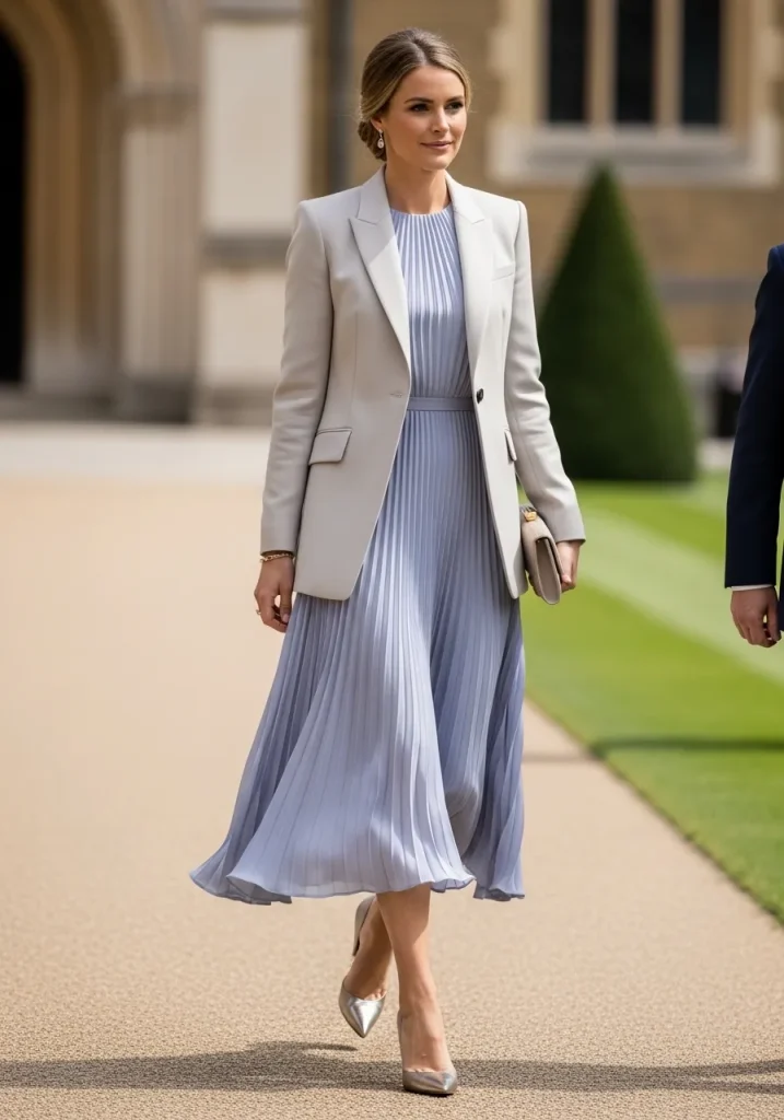 For a polished, sophisticated graduation guest look, consider pairing a pleated midi dress with a structured blazer. The pleats in the dress provide movement and texture, while the blazer adds a touch of professionalism and structure. This combination works well for high school or college graduation ceremonies, where you want to balance elegance with comfort.