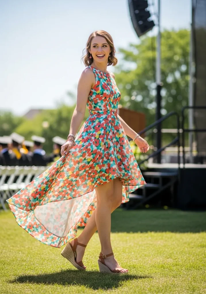 This outfit is perfect for high school graduation ceremonies, offering a youthful, fresh appearance. Pair it with cute wedges or heeled sandals to elevate the look and add some height. The high-low hemline makes it easy to show off your shoes while also creating movement with each step. It’s a unique, stylish choice that will make you stand out as a guest at the graduation.