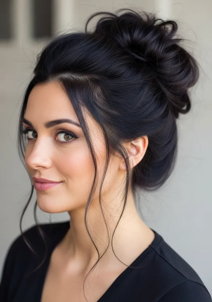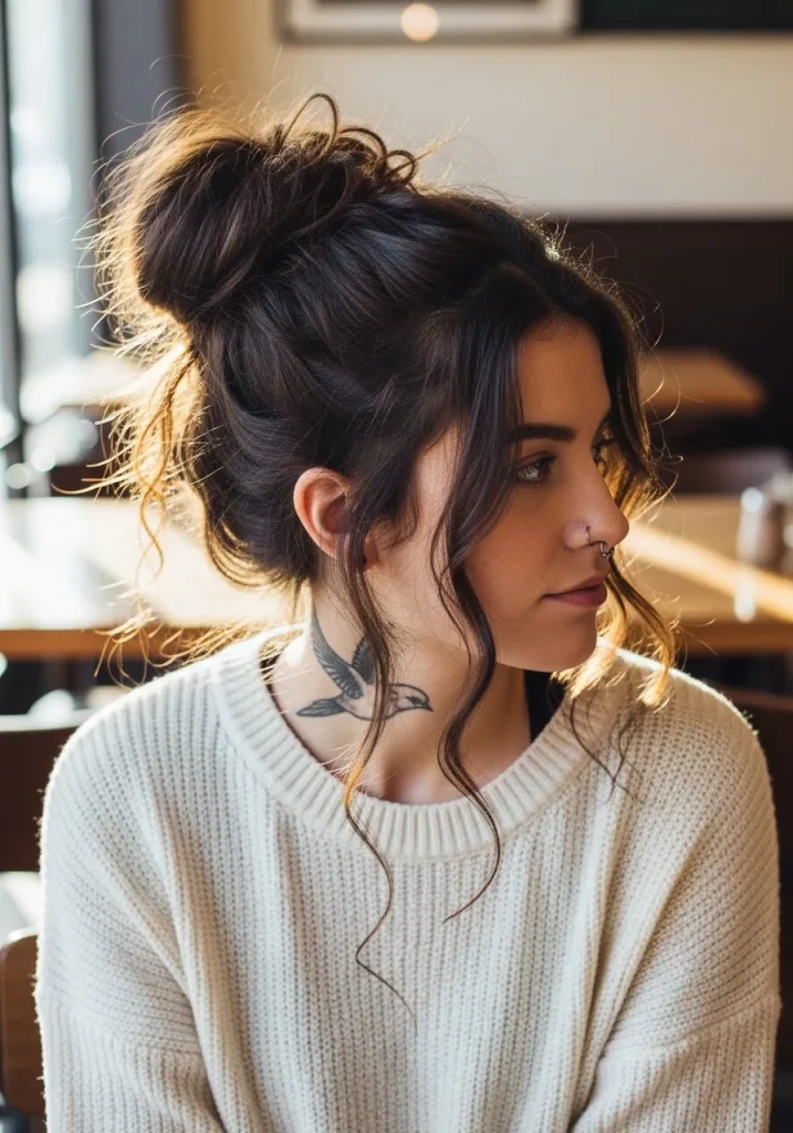 For a laid-back yet elegant look, a loose messy bun is a perfect choice. This hairstyle is both easy to do and stylish enough for any occasion. It’s great for those days when you don’t want to spend too much time on your hair but still want to look put-together.