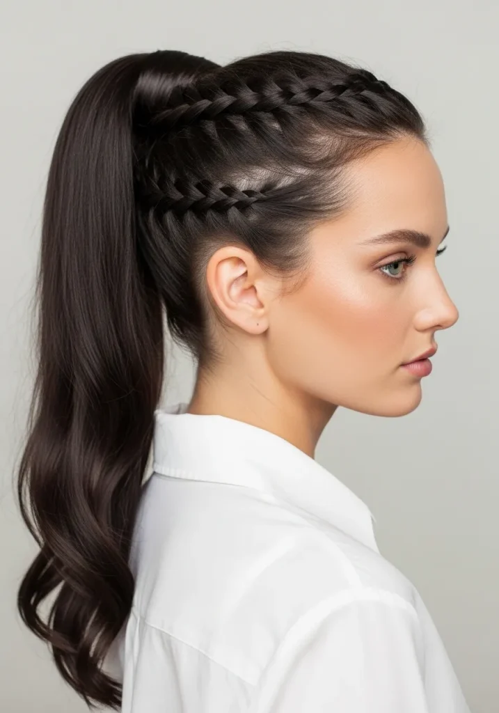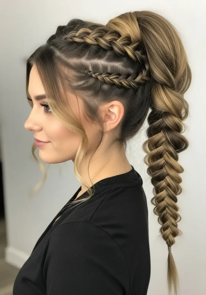 A high braided ponytail is both practical and stylish, providing a polished yet playful look. It’s a versatile hairstyle that can be worn for a variety of occasions, whether you’re hitting the gym or attending a semi-formal event. The braid adds a unique touch, while the ponytail keeps things neat and easy to manage.