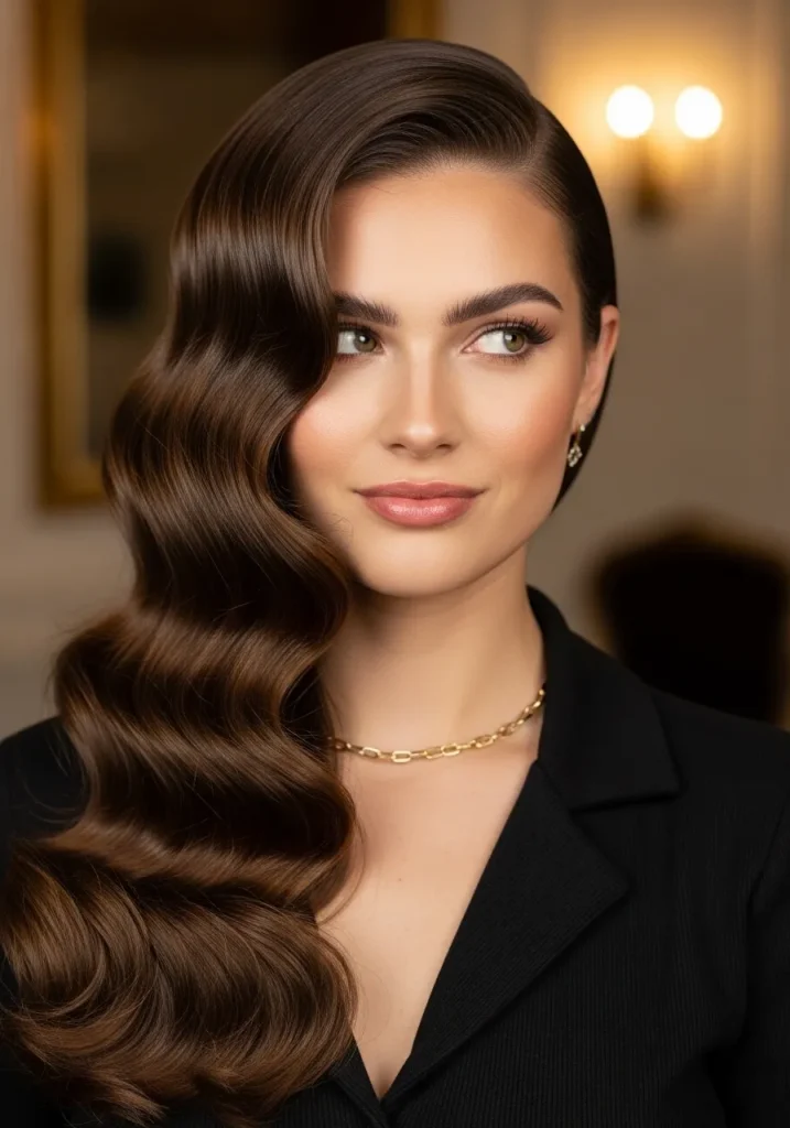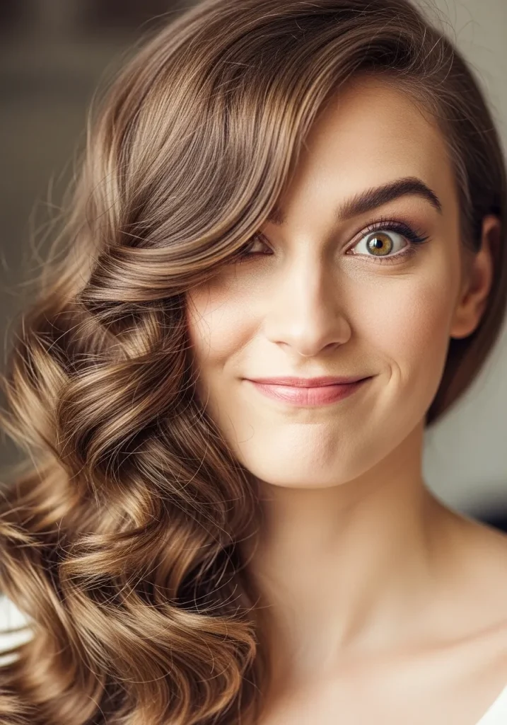 To create this look, curl your hair in large sections using a curling iron. Once the curls are set, gently brush them out to create soft, voluminous waves. Sweep the hair to one side and secure it with pins for a polished, asymmetrical look.