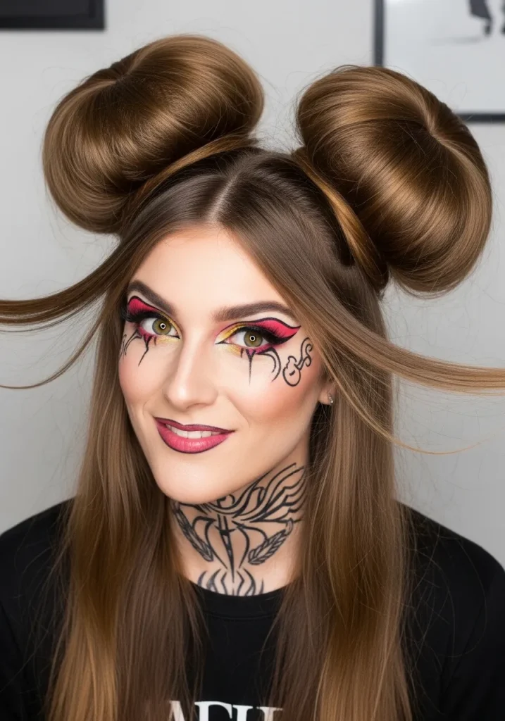 To create this hairstyle, divide your hair into two sections and twist each section into a small bun. Secure the buns with pins and let them sit high on your head. The double bun works best with voluminous hair, adding a cute, youthful vibe to your overall look.