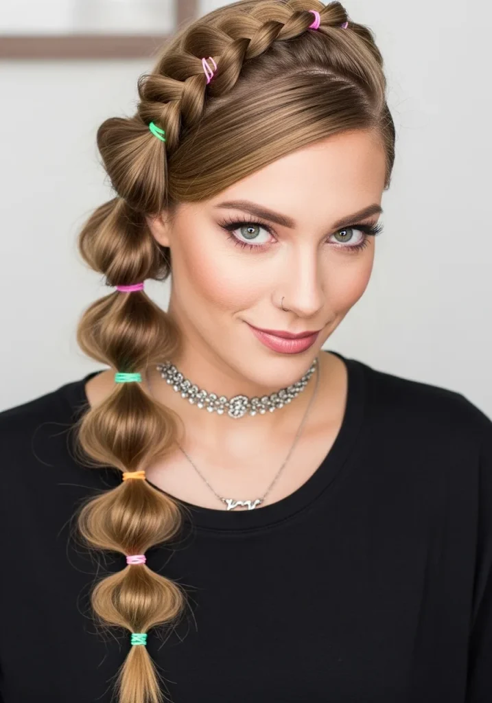 To create a bubble braid, start by tying your hair into a ponytail. Then, take sections of the ponytail and secure them with elastics at different intervals to create “bubbles.” Gently pull each section to create volume and texture. This braid is bold, fun, and perfect for showcasing long hair in a trendy way.