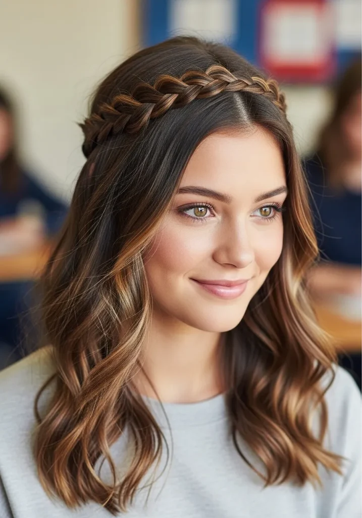 This style is ideal for those with medium to long hair who want something unique but simple. It’s a great way to make your hair look styled without spending too much time on it. Plus, the braided headband can be dressed up or down depending on your school’s dress code or your mood for the day.