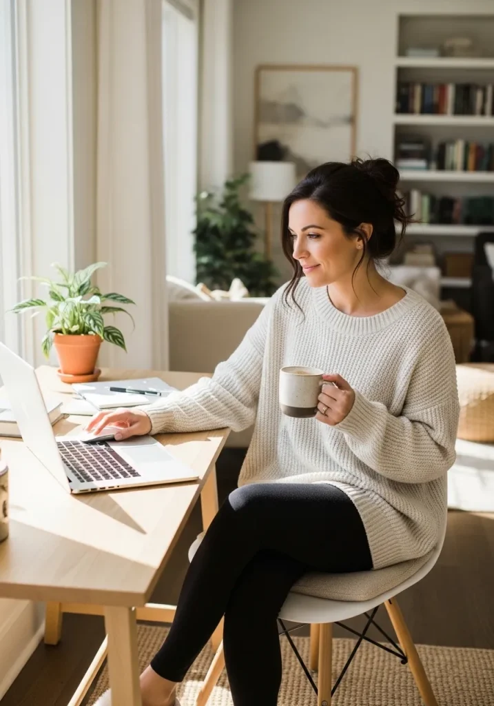 Looking good at home starts with choosing the right clothes. Comfortable yet stylish outfits are the secret to feeling and looking good while you work or relax. Opt for flattering loungewear, like a fitted sweater with leggings, or a casual dress that feels like pajamas but looks chic. The key is to find pieces that make you feel confident and put-together without sacrificing comfort. Pairing simple jewelry or a stylish headband can elevate the look without too much effort.