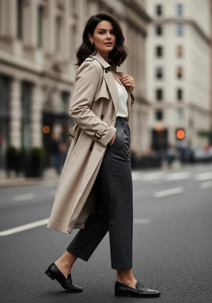 A trench coat layered over tailored pants creates a timeless and sophisticated outfit. This look pairs perfectly with loafers, adding to its polished and refined aesthetic.