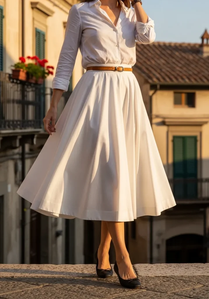 2. White Full Skirt with Button-Down for Classic Italian Elegance