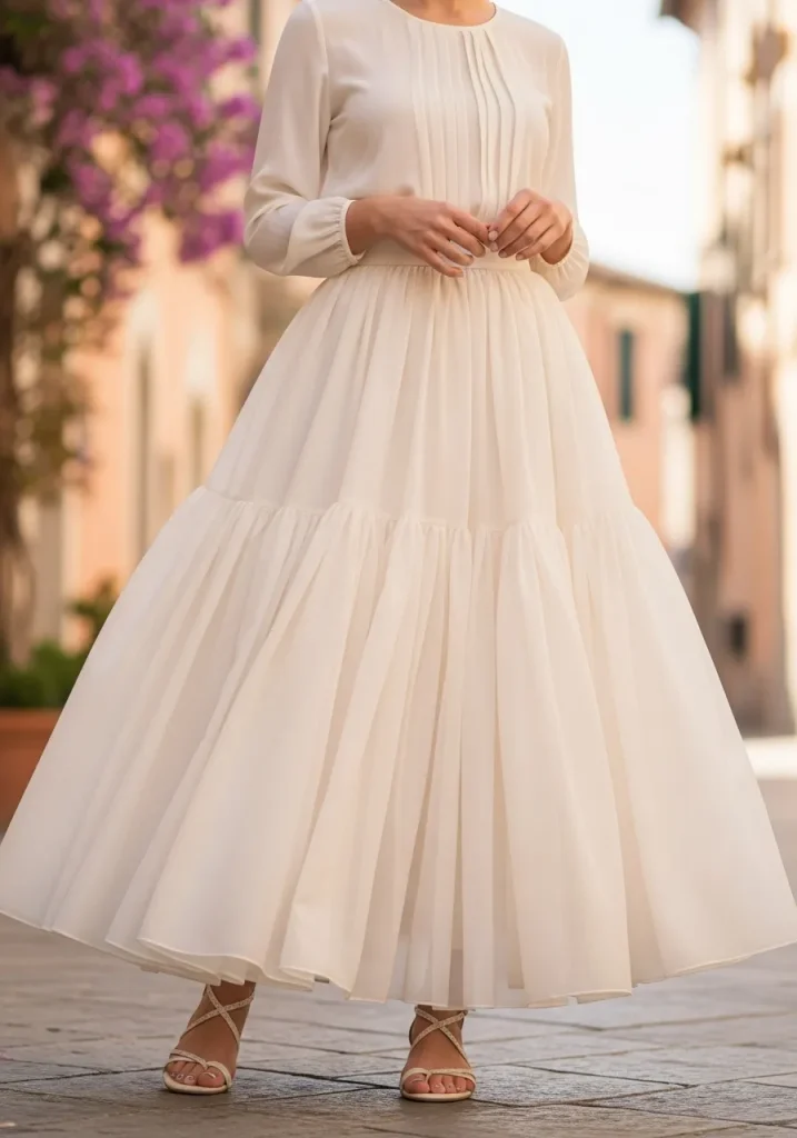 3. Voluminous Cream Skirt with Soft Blouse for Spring in Italy