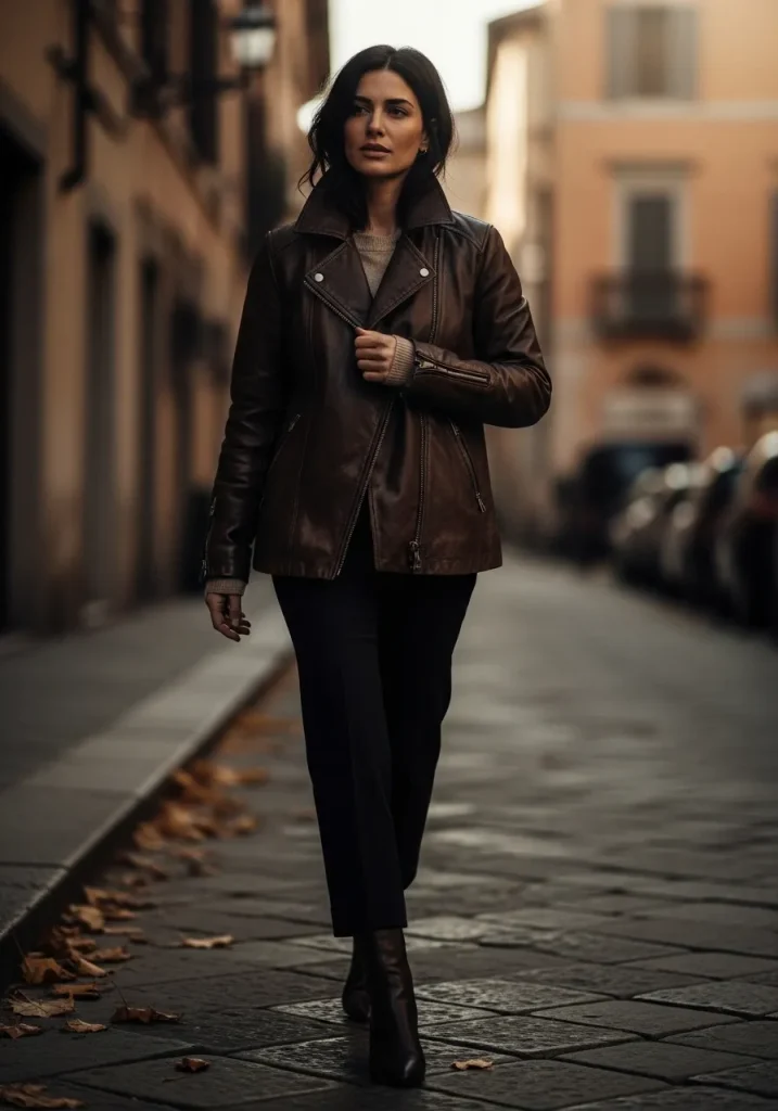9. Dark Brown Leather Jacket Outfit Women Love in Italy