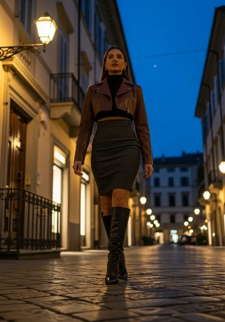 A crop brown jacket outfit brings a modern edge to classic Italian fashion. When styled with a high-waisted skirt or tailored trousers, the cropped silhouette highlights proportions without feeling trendy or overdone. This look is particularly effective for transitional weather, blending warmth with breathability. It works beautifully for white full skirt for fall or white midi skirt outfit fall combinations.