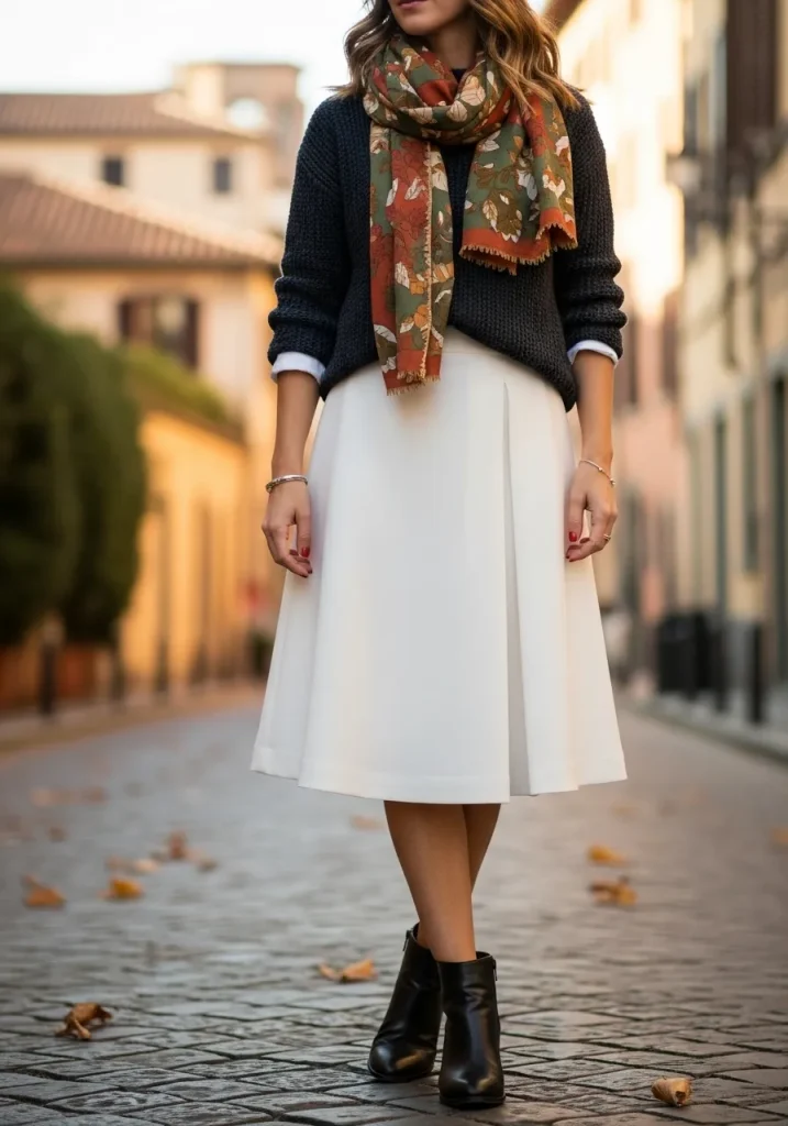 A white skirt outfit autumn styled the Italian way proves that light tones are not limited to summer. Italians pair white skirts with darker knits, leather jackets, or boots to create contrast and depth. This approach feels intentional and fashion-forward while remaining wearable. The look works particularly well in urban settings during mild fall weather.