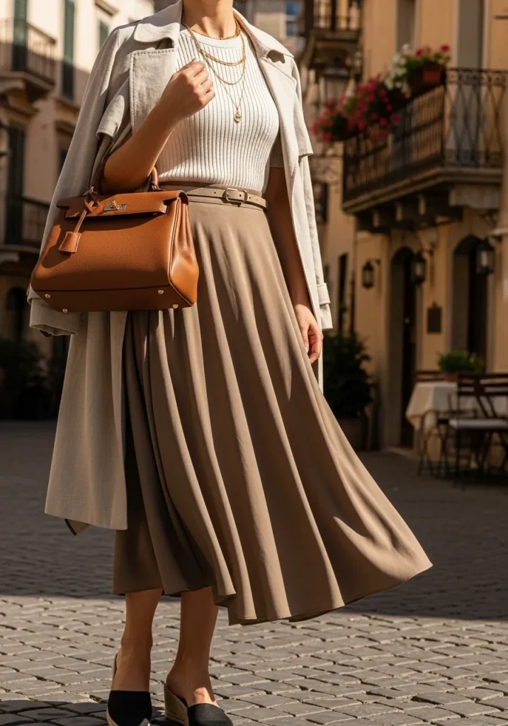 To elevate the outfit further, Italians often add a neutral crossbody bag and minimal gold jewelry for understated luxury. The softness of a white skirt autumn outfit contrasts beautifully with warm beige, camel, or taupe tones commonly seen in European wardrobes. This outfit also transitions effortlessly into café evenings, reflecting how Italy outfit inspiration prioritizes versatility. It’s a timeless option for anyone curating Italy trip outfits with a polished European feel.