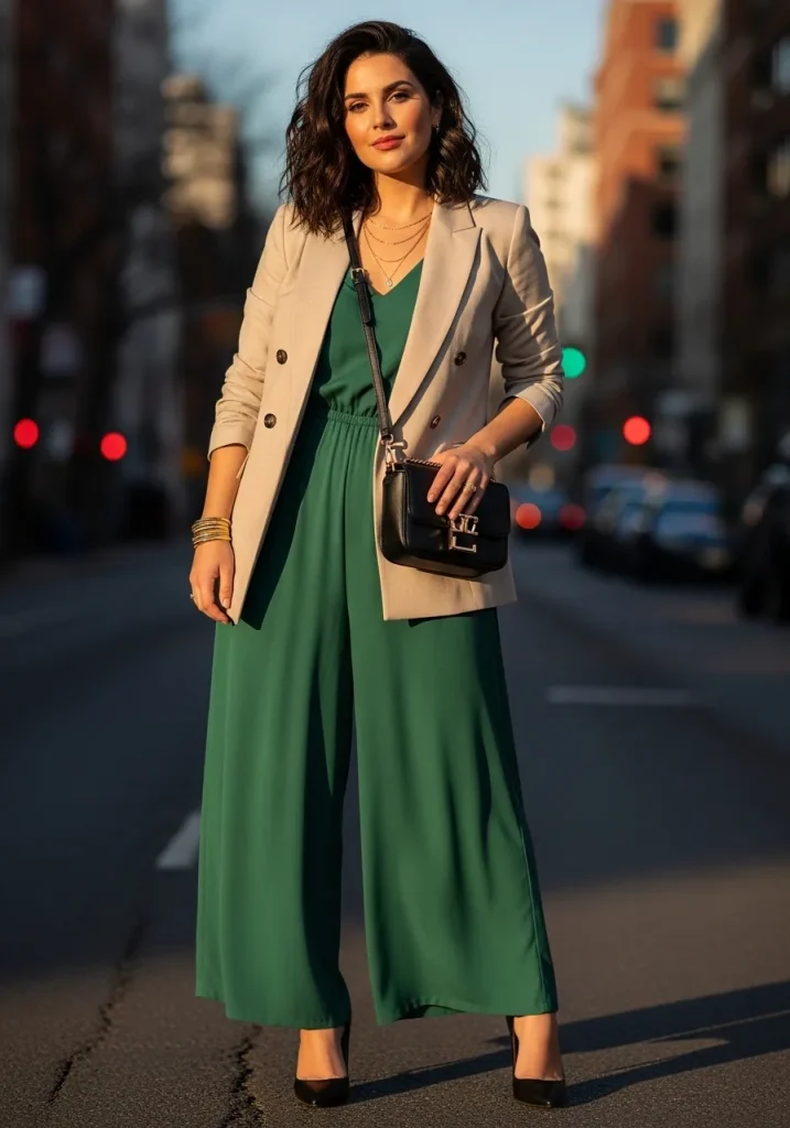 A tailored jumpsuit layered with a blazer and styled with sneakers creates a modern and professional outfit that blends comfort with structure. The blazer elevates the look, while the sneakers keep it practical for busy days.