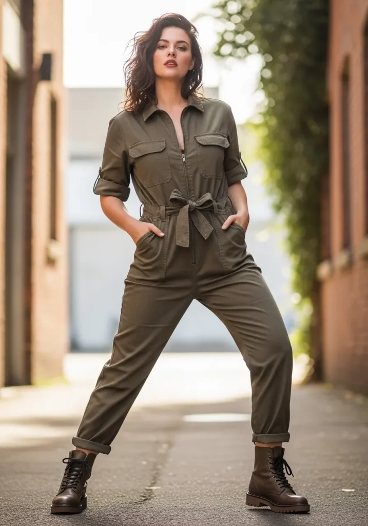 A utility jumpsuit paired with boots creates a bold and practical outfit that feels both stylish and functional. The structured design adds a slightly edgy vibe, while the boots enhance the look with a strong finish.