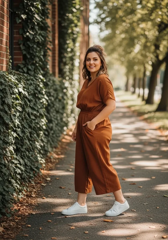 A casual cotton jumpsuit paired with sneakers creates an easy and comfortable outfit that’s perfect for everyday wear. The breathable fabric keeps you feeling relaxed throughout the day, while the sneakers add a sporty and laid-back touch that works for errands or casual outings.