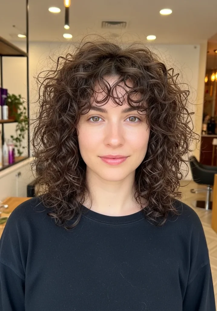 Use curl-enhancing products to define and hydrate your curls. The layers allow movement and bounce, making the hair look dynamic. This style works for both casual and dressy looks. This haircut feels confident and full of life.