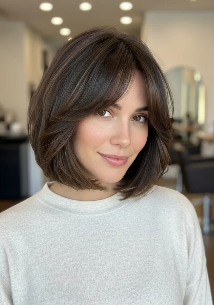 A layered bob with curtain bangs combines structure with softness for a perfectly balanced look. The bob adds shape while the curtain bangs frame the face beautifully. It’s a modern take on a classic style. This haircut feels trendy and flattering.