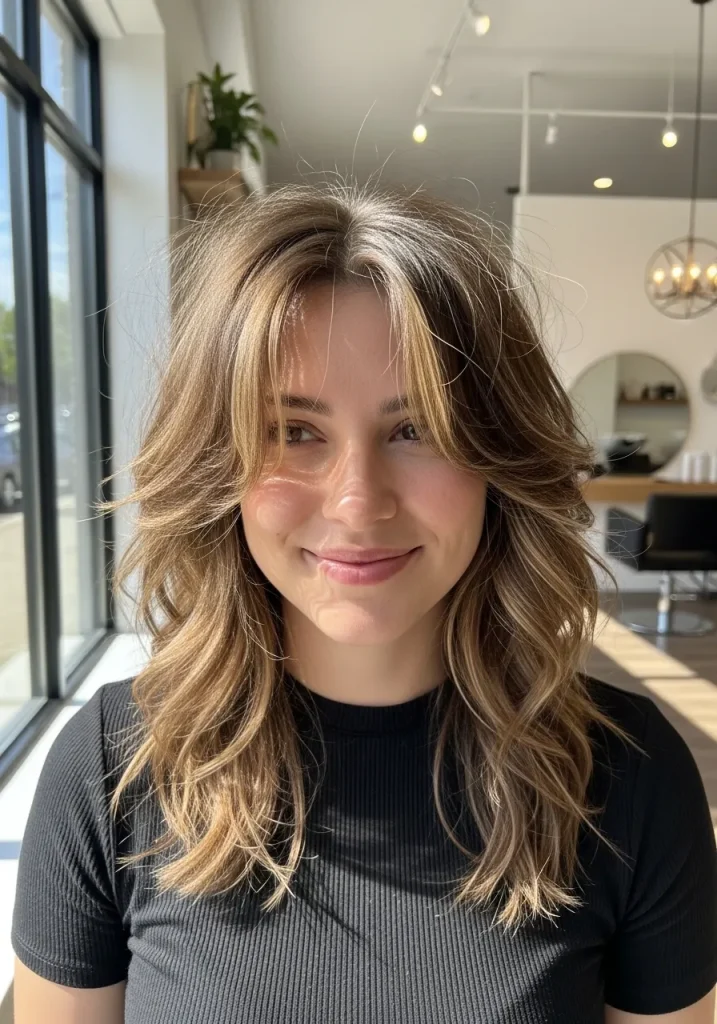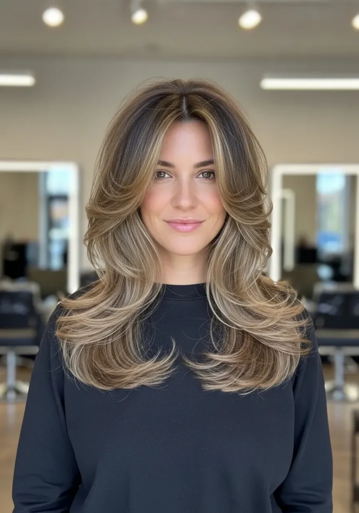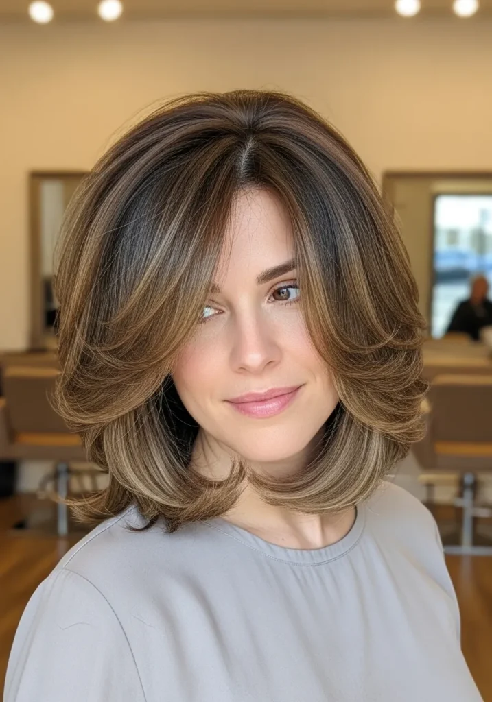 Style with a round brush to enhance the feathered effect and create volume. It works beautifully with medium to long hair lengths. The layers frame the face gently without overwhelming it. This haircut feels polished and timeless.