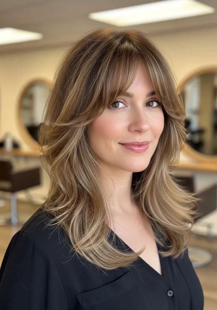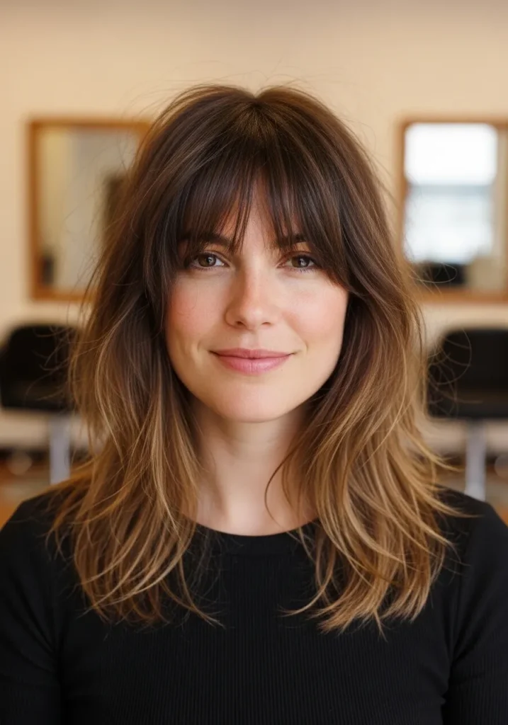 Style with soft waves or a natural blowout for a relaxed finish. The bangs blend seamlessly with the layers for a cohesive look. It’s easy to maintain and grows out beautifully. This haircut feels soft, flattering, and versatile.