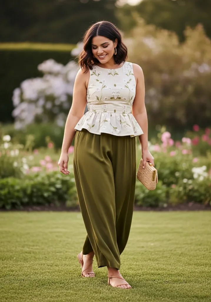 A peplum top paired with palazzo pants creates a flattering and feminine outfit that highlights the waist beautifully. The peplum detail adds shape, balancing the wide-leg silhouette.
