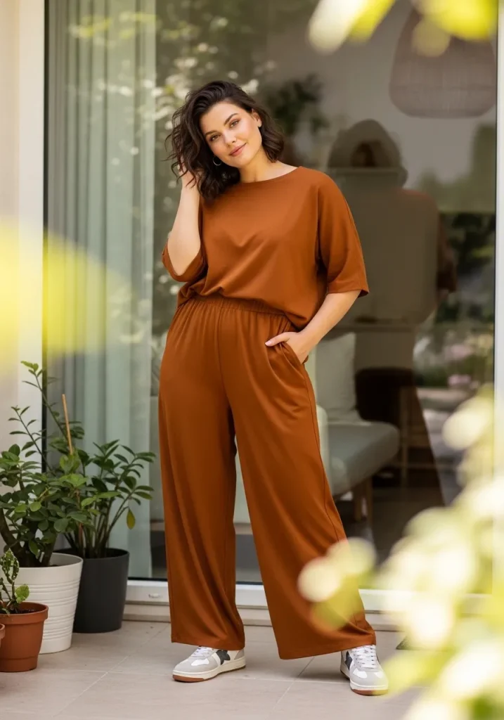A matching palazzo pants set creates a cohesive and stylish outfit that feels effortlessly put-together. The coordinated pieces make styling easy while still looking modern and trendy.