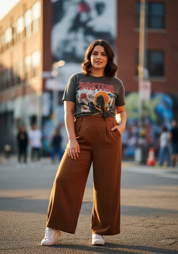 A graphic tee paired with palazzo pants creates a relaxed and slightly edgy outfit that feels perfect for casual days. The graphic detail adds personality, while the flowy pants soften the overall look.