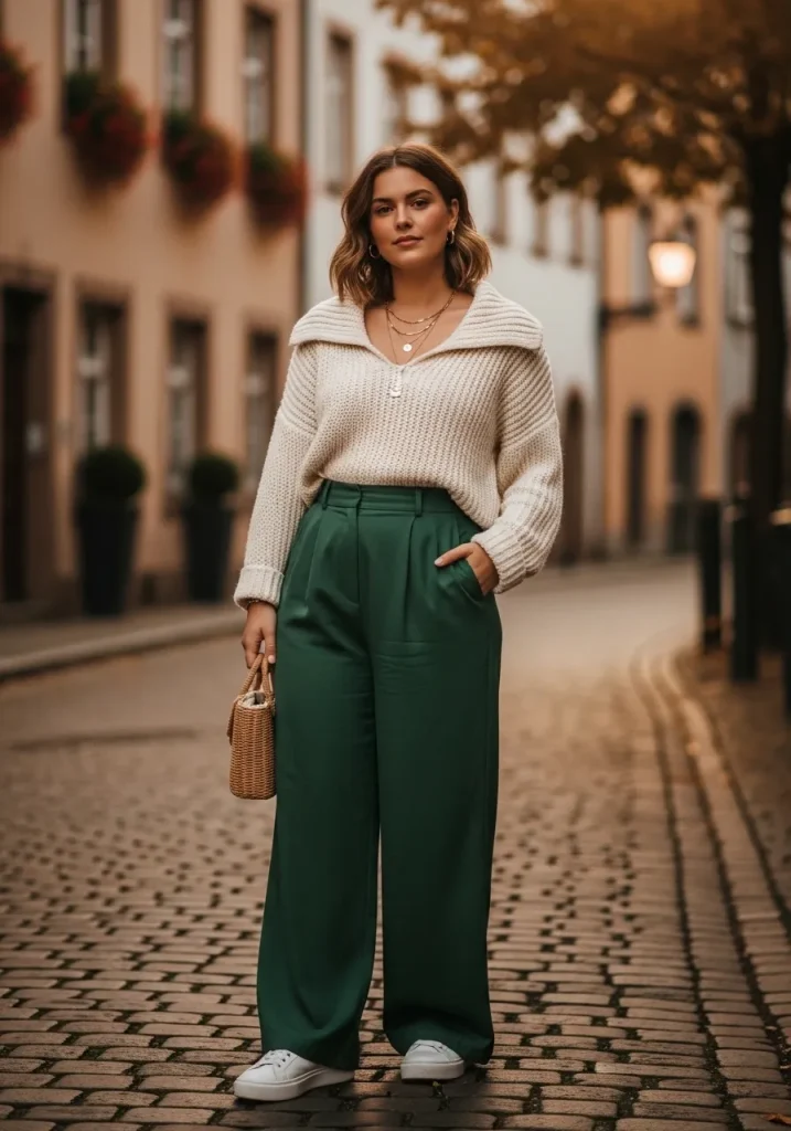 A lightweight knit sweater paired with palazzo pants creates a cozy yet breathable outfit that works well for transitional weather. The sweater adds warmth, while the pants keep the look relaxed.