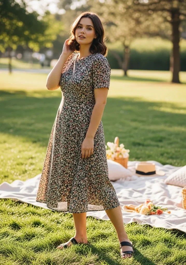 A floral midi dress paired with sandals is the ultimate picnic outfit that feels soft, romantic, and effortlessly feminine. The flowy fabric moves beautifully in the breeze, while the floral print adds a fresh and playful touch that fits perfectly with outdoor settings.