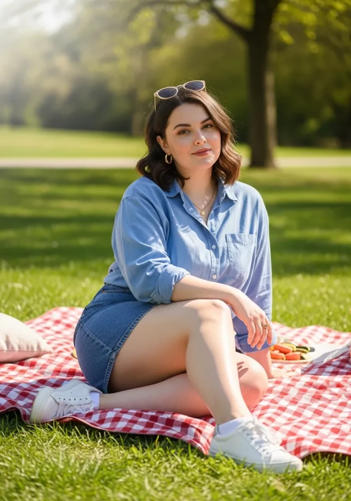 A button-down shirt paired with a denim skirt creates a relaxed yet polished picnic outfit that feels both classic and easy to wear. The structured shirt balances the casual vibe of the skirt, giving you a look that feels effortlessly put-together.