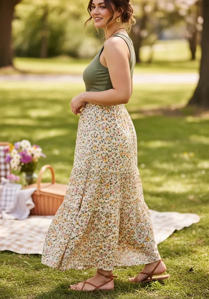 Pair this outfit with sandals and delicate jewelry for a soft finish. This look is ideal for warm weather picnics and feels light and beautiful.